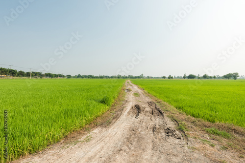 © peangdao, Obraz premium Dirt road go to the rice paddy farmland