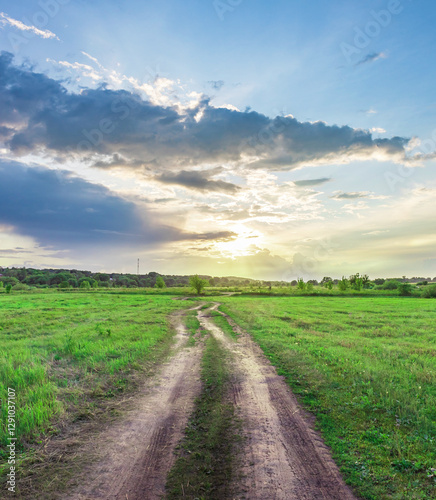 © Sergei, Obraz premium Dirt road in a field with a cloudy sky in the background