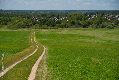 © Елена Челышева, Fototapeta premium dirt road in a field with grain crops leading to the village