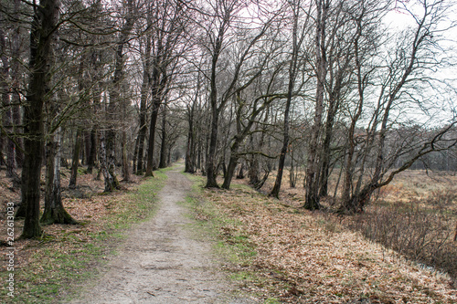 © Rezona, Fototapeta premium Dirt road in a forest besides heath with a cloudy sky