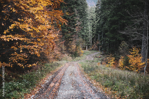 Fototapeta premium Dirt road in a forest in Romania during a rainy and cold November day.