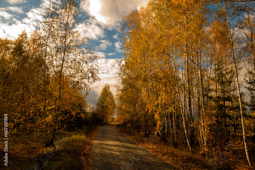 Obraz premium Dirt road in an autumn birch forest. Beautiful sunny day