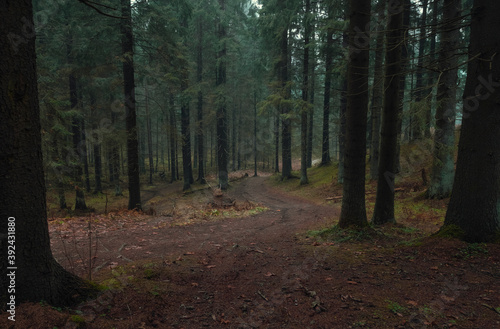 Fototapeta premium dirt road in dark autumn northern forest in fall
