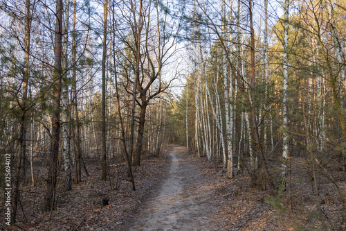 Fototapeta premium Dirt road in deciduous forest in early spring