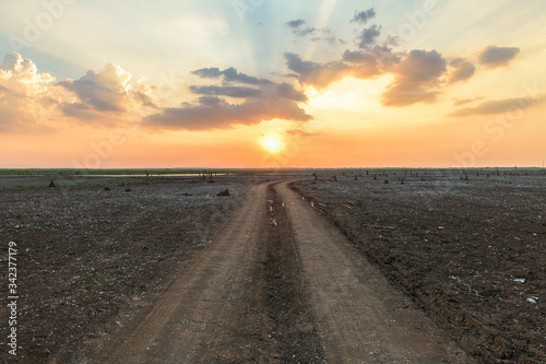 © yotrakbutda, Naklejka premium Dirt road in the parched lake with sunset sky