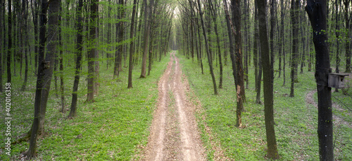 © CreativeSuburb, Obraz premium Dirt road in the spring forest. Top view.