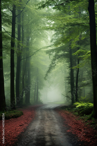© vvalentine, Fototapeta premium dirt road in the woods with trees and foggy fog, generative ai