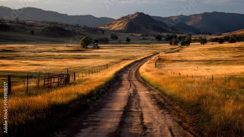 Naklejka premium Dirt road leading through golden fields towards distant mountains under a...