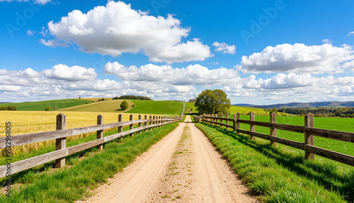 Fototapeta premium Dirt road leading through green fields under a blue sky with clouds