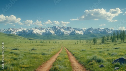 © Lemdah, Fototapeta premium Dirt road leads to snow-capped mountains.