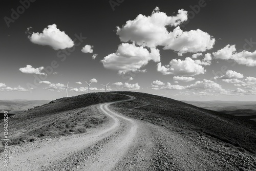 Fototapeta premium Dirt road leads uphill to turbines under sky, renewable energy concept