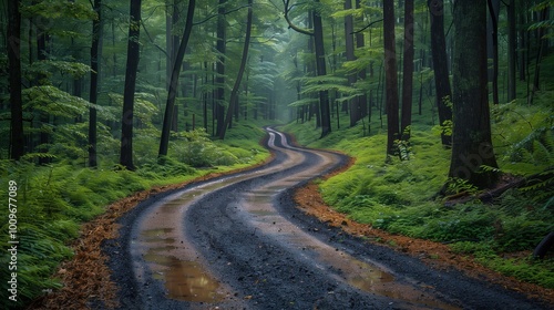 Fototapeta premium Dirt road or recording in a foggy and rainy forest