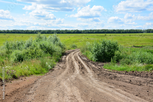 © Irina, Obraz premium Dirt road through a green field going down the hill with a blue sky and fluffy clouds
