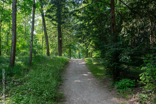 Fototapeta premium Dirt road through a green forest