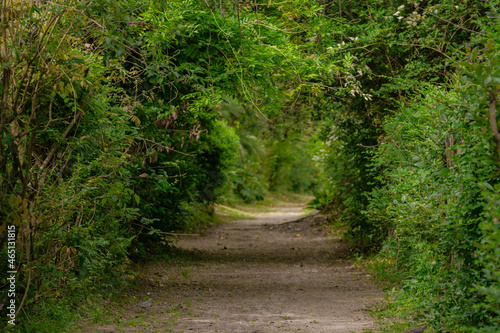 Fototapeta premium Dirt road through a lush green forest that frames it.