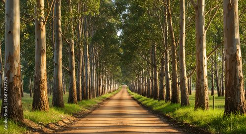 © Andre Bimbatti, Fototapeta premium Dirt road through eucalyptus sítio