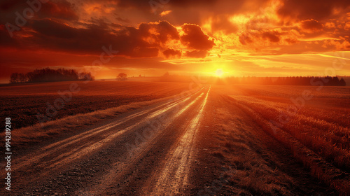 © Odin, Fototapeta premium Dirt road through farmland at sunset with dramatic clouds and golden light
