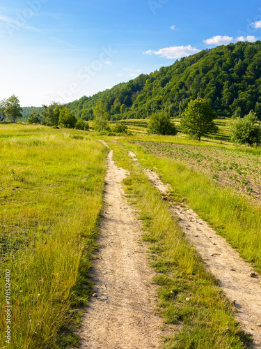 © Lesia, Obraz premium dirt road through field in mountains. beautiful rural landscape of ukraine in summer. scenic view of a countryside green environment under blue sky with clouds in evening light. forest on the hill