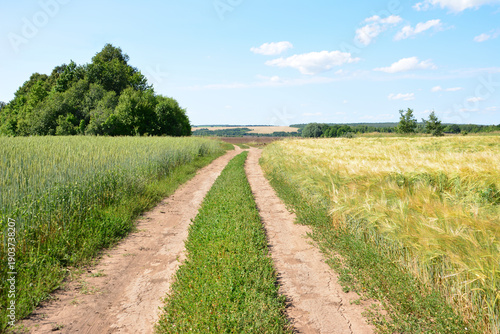Obraz premium Dirt Road Through Golden and Green Fields leading to horizon copy space