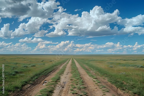 © Valentin, Naklejka premium Dirt road through grass field under blue sky