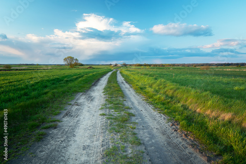© darekb22, Fototapeta premium Dirt road through green fields and clouds above the horizon