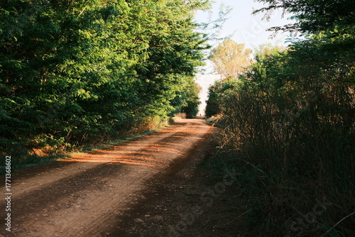 © Dylan, Fototapeta premium Dirt Road Through Green Forest with Morning Light