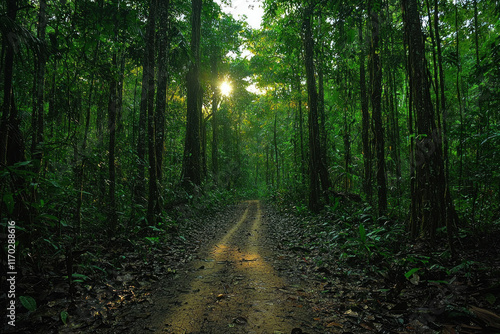 Obraz premium Dirt road through lush green tropical rainforest with sun peeking through trees.