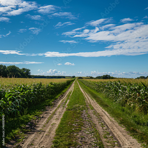 © yuniazizah, Fototapeta premium Dirt road through maize green field under blue sky