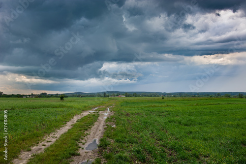 Obraz premium Dirt road through the field and storm clouds in the sky