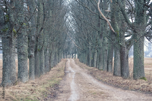 Fototapeta premium Dirt road through the gloomy forest of oaks