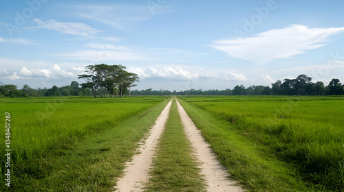 © Muhyidin, Fototapeta premium Dirt Road Through Vibrant Green Field Under Blue Sky and Sunlight in Rural Landscape
