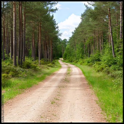 © Big9869, Fototapeta premium Dirt road winding through a lush green pine forest on a sunny day.