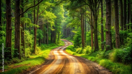 Obraz premium Dirt Road Winding Through Lush Forest, trees, natural scenery, trees,...