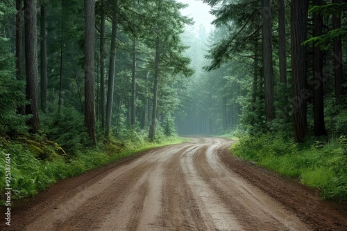 Naklejka premium Dirt road winding through pine forest, rugged and wild