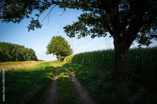 © Mentor, Obraz premium Dirt road with corn field, trees, electricity poles and a beautiful blue sky