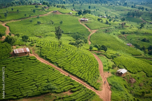 Naklejka premium Dirt roads winding through lush green tea plantation in rwanda