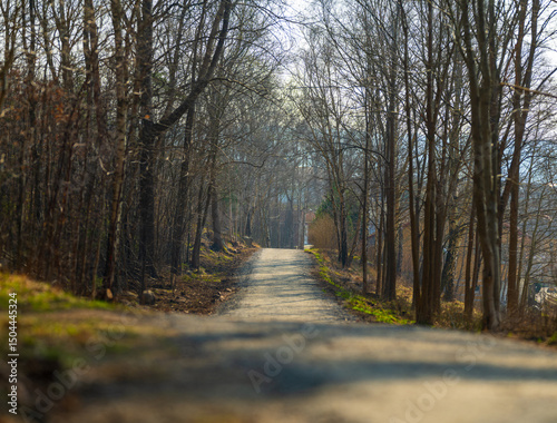 © Trygve, Obraz premium Dirt Trail Path Through Bare Forest In Spring.