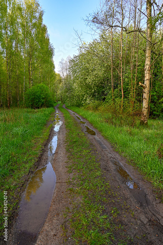 © Jonas, Fototapeta premium dirtroad with pools of water through forest