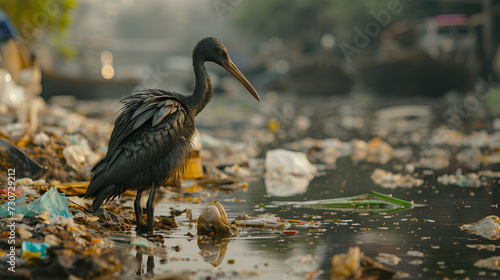 Naklejka premium Dirty bird stands among garbage and plastic trash. Environmental pollution, toxic emissions into water, oil pollution, The environment is not good.
