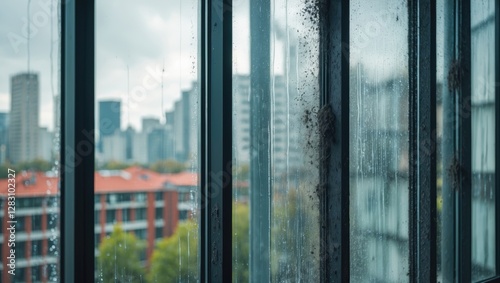 Fototapeta premium Dirty double glazed office window after acid rain showing dust and grime with a cityscape in the background creating an urban atmosphere.