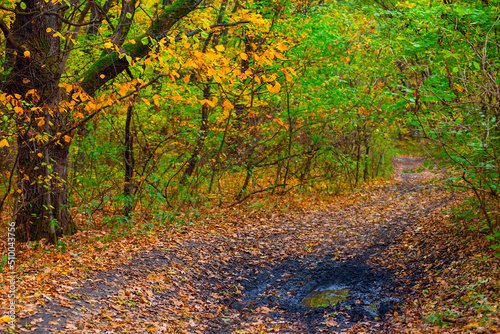 © Yuriy Kulik, Fototapeta premium dirty ground road covered by dry leaves in forest, autumn natural background