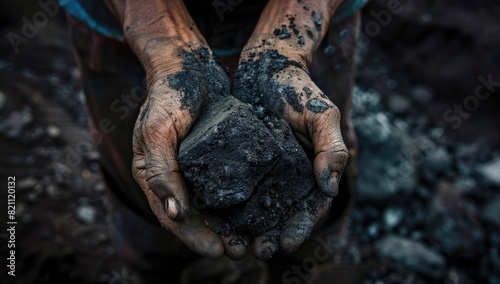 Fototapeta premium Dirty Hand Holding Raw Coal