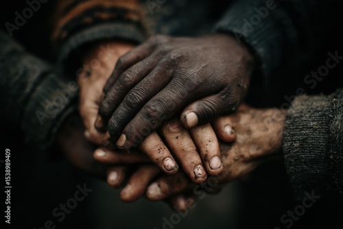 © Can Berkol, Fototapeta premium dirty hands clasped together symbolizing unity, trust, and teamwork in tough conditions