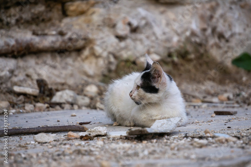 Fototapeta premium Dirty, homeless little kitty cat in the Streets of Old Havana City, Capital of Cuba, during a sunny day.