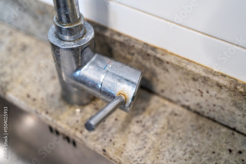 Obraz premium Dirty kitchen sink faucet contaminated with calcium and dirt.
