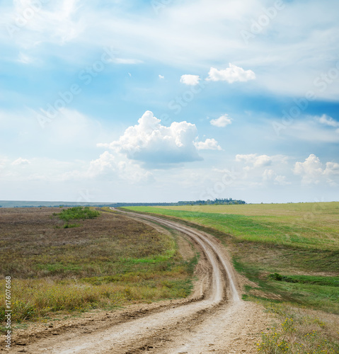 Fototapeta premium dirty road in field and blue sky with clouds