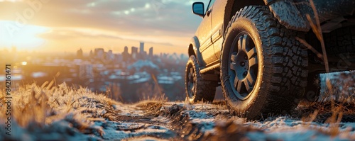 Naklejka premium Dirty tires of a SUV overlooking a cityscape at sunrise