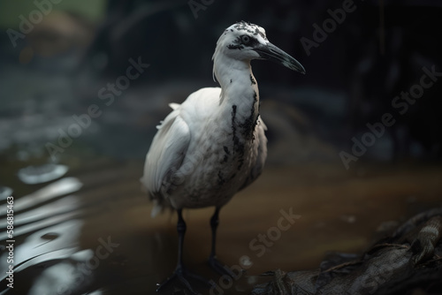 Naklejka premium Dirty white bird standing in muddy puddle. Ecological problem environmental pollution. Generative AI