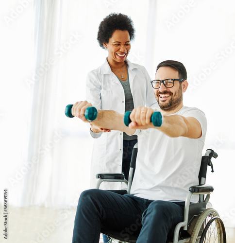 © Lumos sp, Obraz premium disability wheelchair disabled man handicap exercise training home dumbbell physical therapy recovery therapist doctor nurse rehab lifting weight