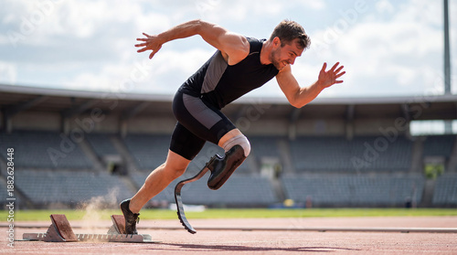 Obraz premium Disabled Athlete Explosive Start on Track, Paralympic Sprint Power